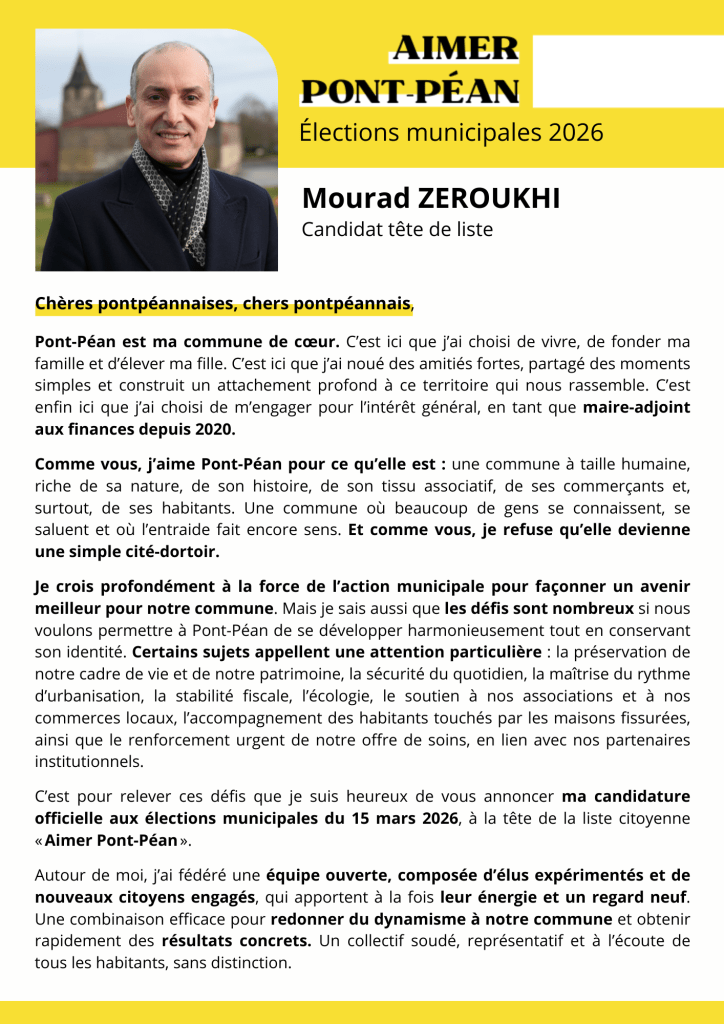 Nous publions aujourd’hui la lettre de candidature de Mourad ZEROUKHI, tête de liste du groupe citoyen Aimer Pont-Péan.