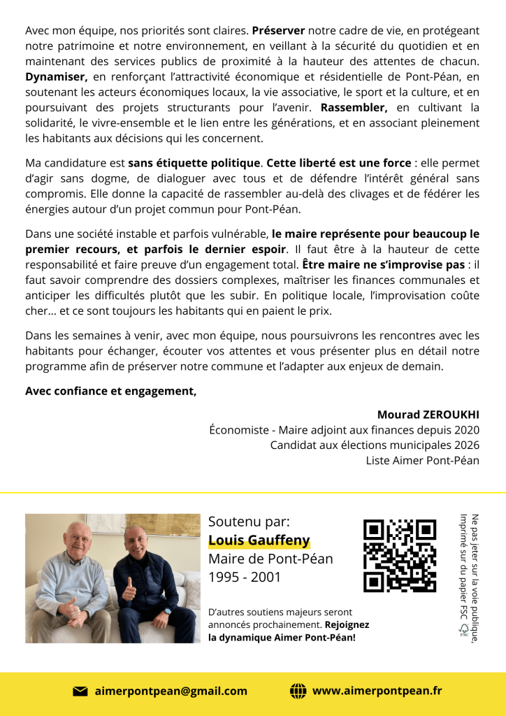 Il y partage son parcours, la vision construite avec ses colistiers et les priorités pour dynamiser Pont-Péan, tout en préservant ce qui fait l’âme de notre commune.