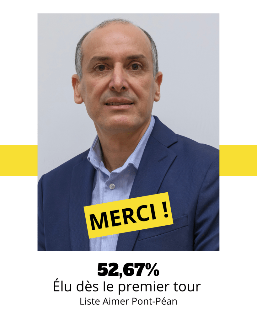 Avec 52,67 % des voix dès le premier tour, vous avez choisi de faire confiance à la liste Aimer Pont-Péan. Merci sincèrement pour ce soutien et pour la confiance que vous nous accordez.